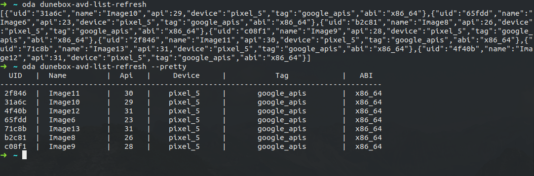 <table><thead><tr><th width="208" align="center">Field</th><th width="196" align="center">Type</th><th>Intepretation</th></tr></thead><tbody><tr><td align="center"><code>uid</code></td><td align="center"><code>String</code></td><td>UID of the configured AVD</td></tr><tr><td align="center"><code>name</code></td><td align="center"><code>String</code></td><td>Name of the configured AVD</td></tr><tr><td align="center"><code>api</code></td><td align="center"><code>uint8</code></td><td>API level of the configured AVD</td></tr><tr><td align="center"><code>device</code></td><td align="center"><code>String</code></td><td>Device of configured AVD</td></tr><tr><td align="center"><code>tag</code></td><td align="center">S<code>tring</code></td><td>AVD Base image tag (e.g. <code>google_apis</code>)</td></tr><tr><td align="center"><code>abi</code></td><td align="center"><code>String</code></td><td>Application Binary Interface of the AVD (e.g. <code>x86_64</code>)</td></tr></tbody></table>